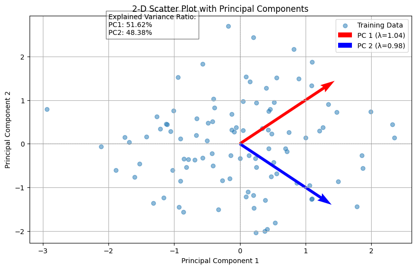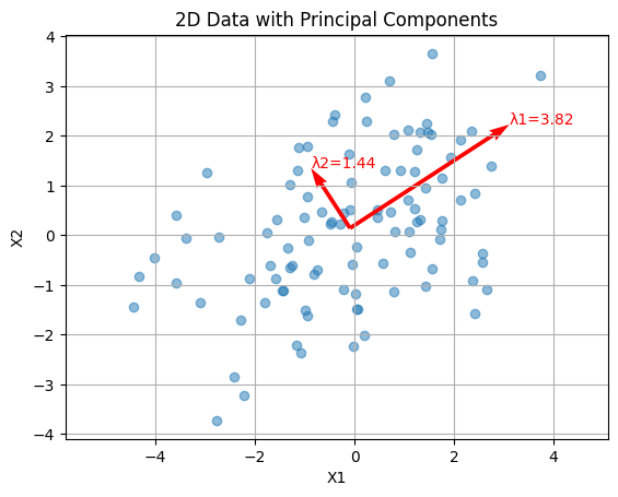 plt.quiver(*start, *end, angles='xy', scale_units='xy', scale=1, color=['r', 'b'][i], label=f'PC {i+1} (λ={variance:.2f})')