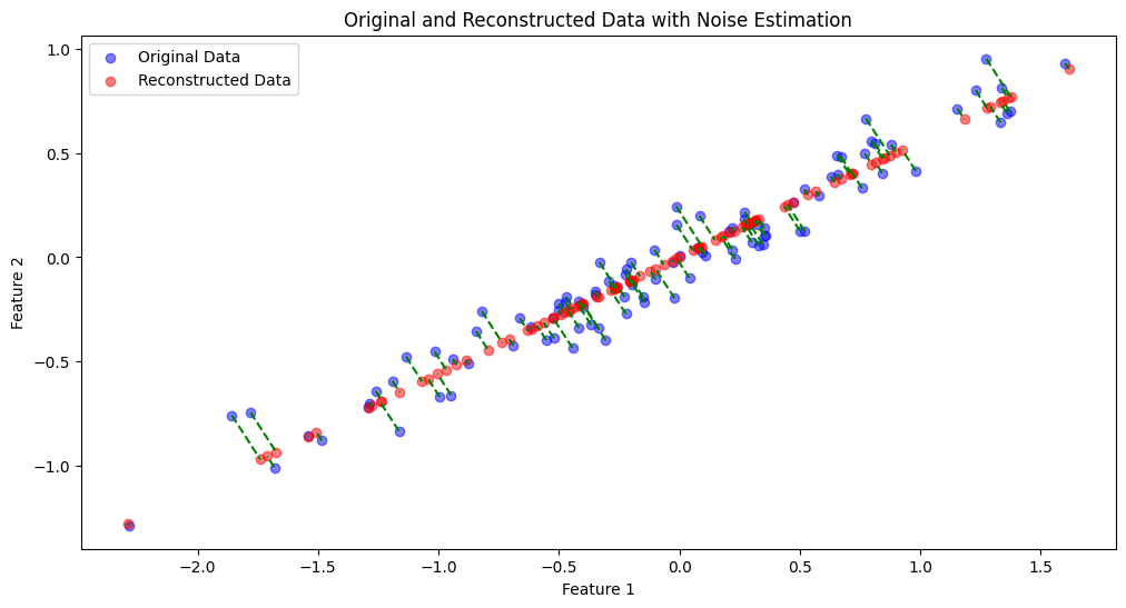plt.title('Original and Reconstructed Data with Noise Estimation')