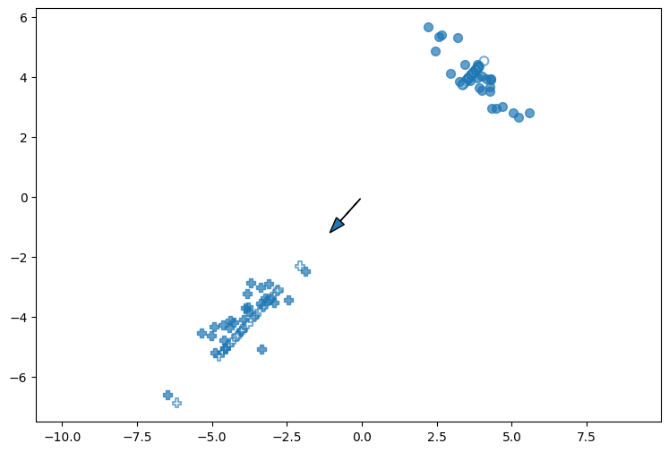 plt.arrow(w[0]*b, w[1]*b, w[0], w[1], head_width=0.35)