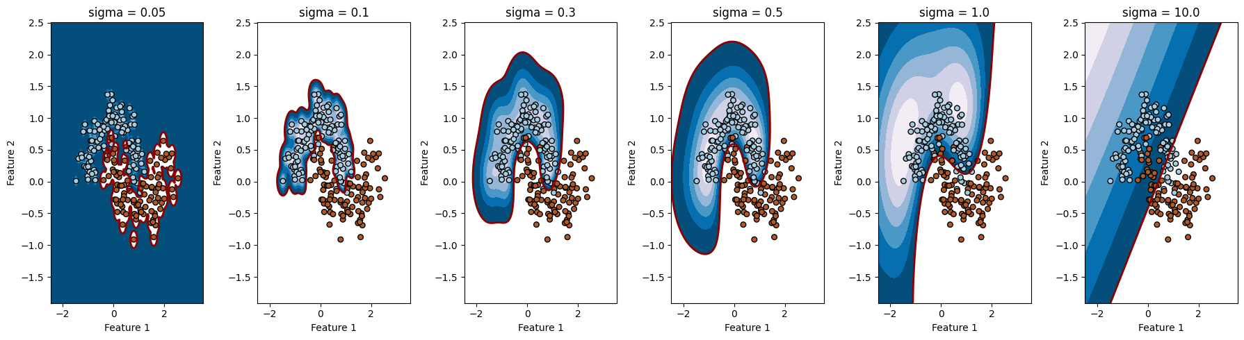 # ترسیم داده ها و مرزهای تصمیم گیری برای هر مقدار sigma