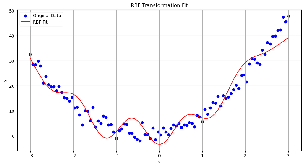 The RBF transformation maps data into a new feature space defined by radial basis functions. The general form of an RBF is:
