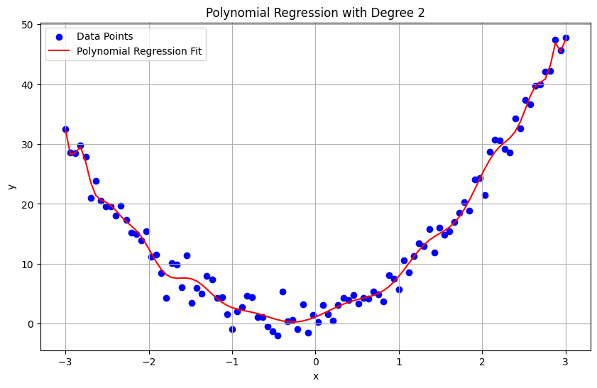 Even though the relationship between \(x\) and \(y\) is non-linear, by transforming \(x\) into polynomial features, we can fit a linear model in this new feature space. The linear regression model in this space finds the best-fitting line (or curve) to the polynomial features.