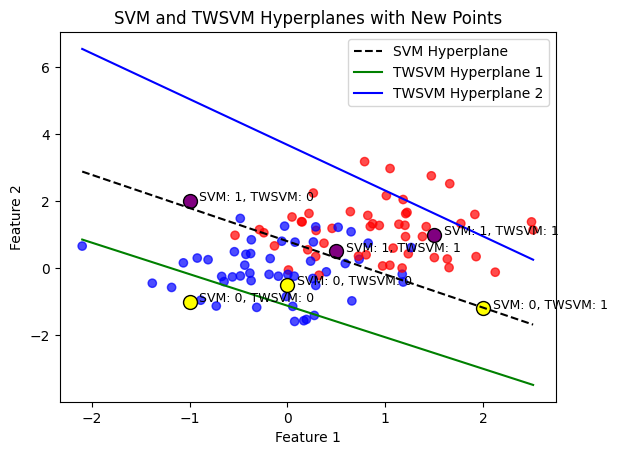 plt.text(point[0] + 0.1, point[1], f'SVM: {svm_predictions[i]}, TWSVM: {twsvm_predictions[i]}', fontsize=9)